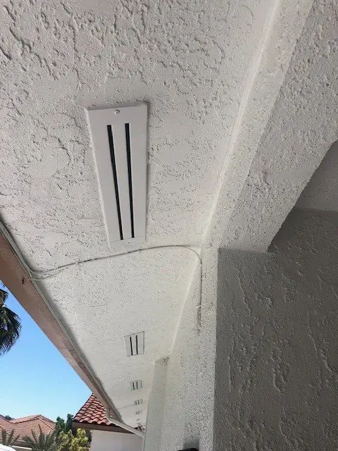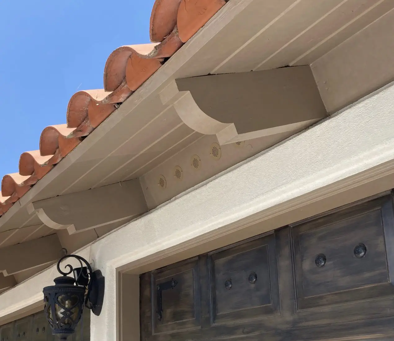 A soffit is the finished underside of a roof’s overhang, enclosed with materials like wood, vinyl, fiber cement or metal to create a clean, protected surface.  It hides the structural elements of the eave while allowing controlled ventilation through vents or perforations.